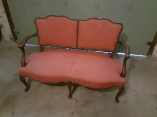 Réfection totale de cette banquette (méthode et matériaux traditionnels), remplacement de la couverture et finition cloutée | tissu de chez Casal